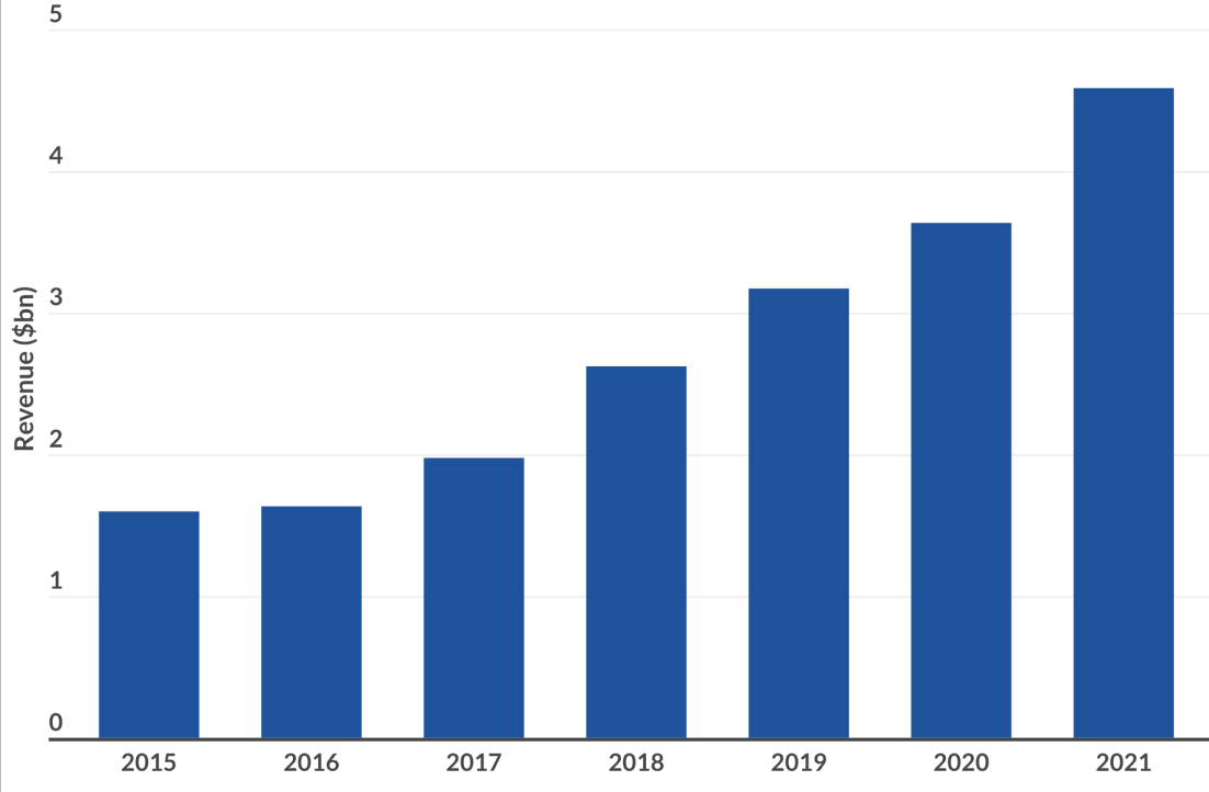 After a slump in the early 2010s, dating app revenues have increased every year since 2015, reaching $5.61 billion in 2021.